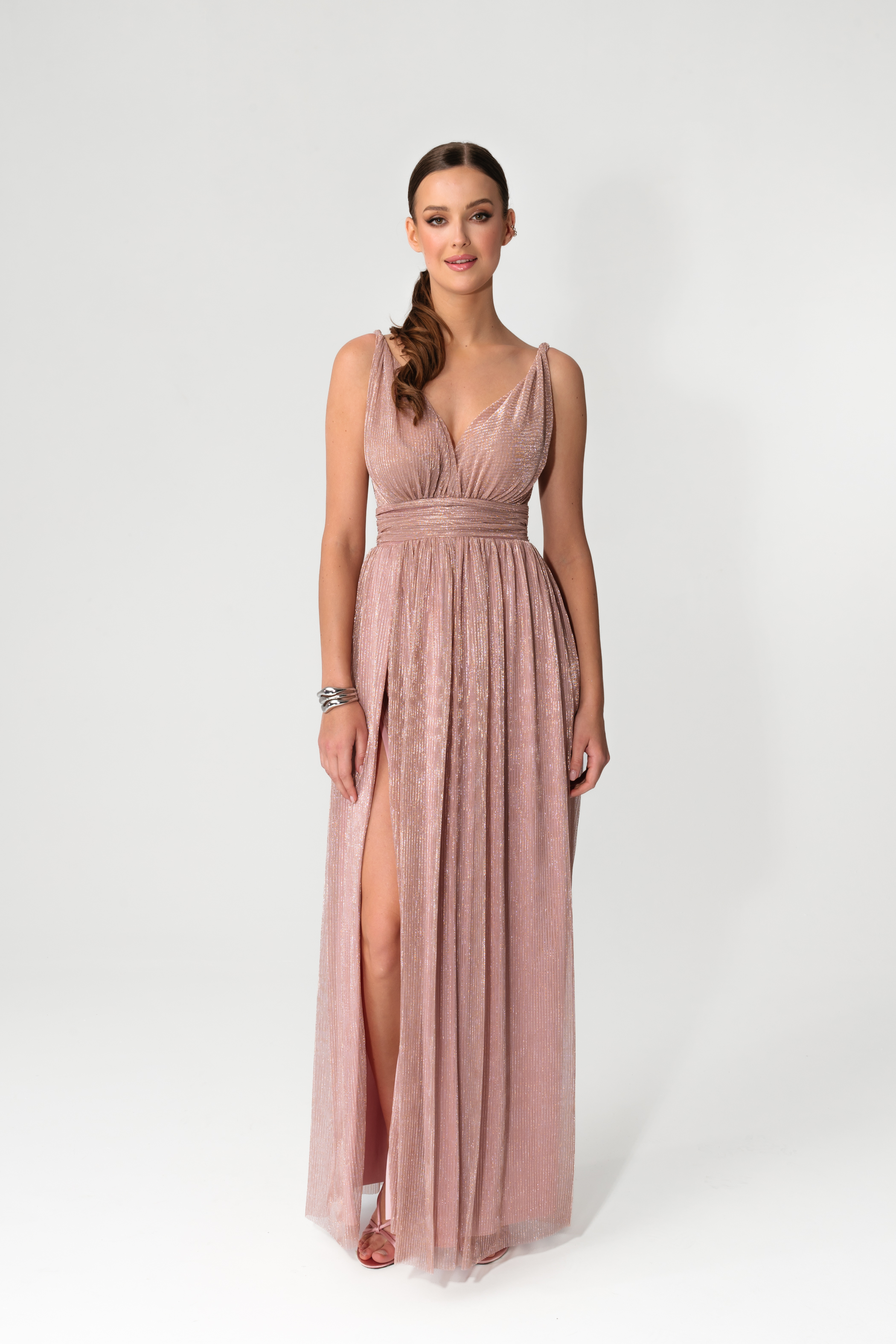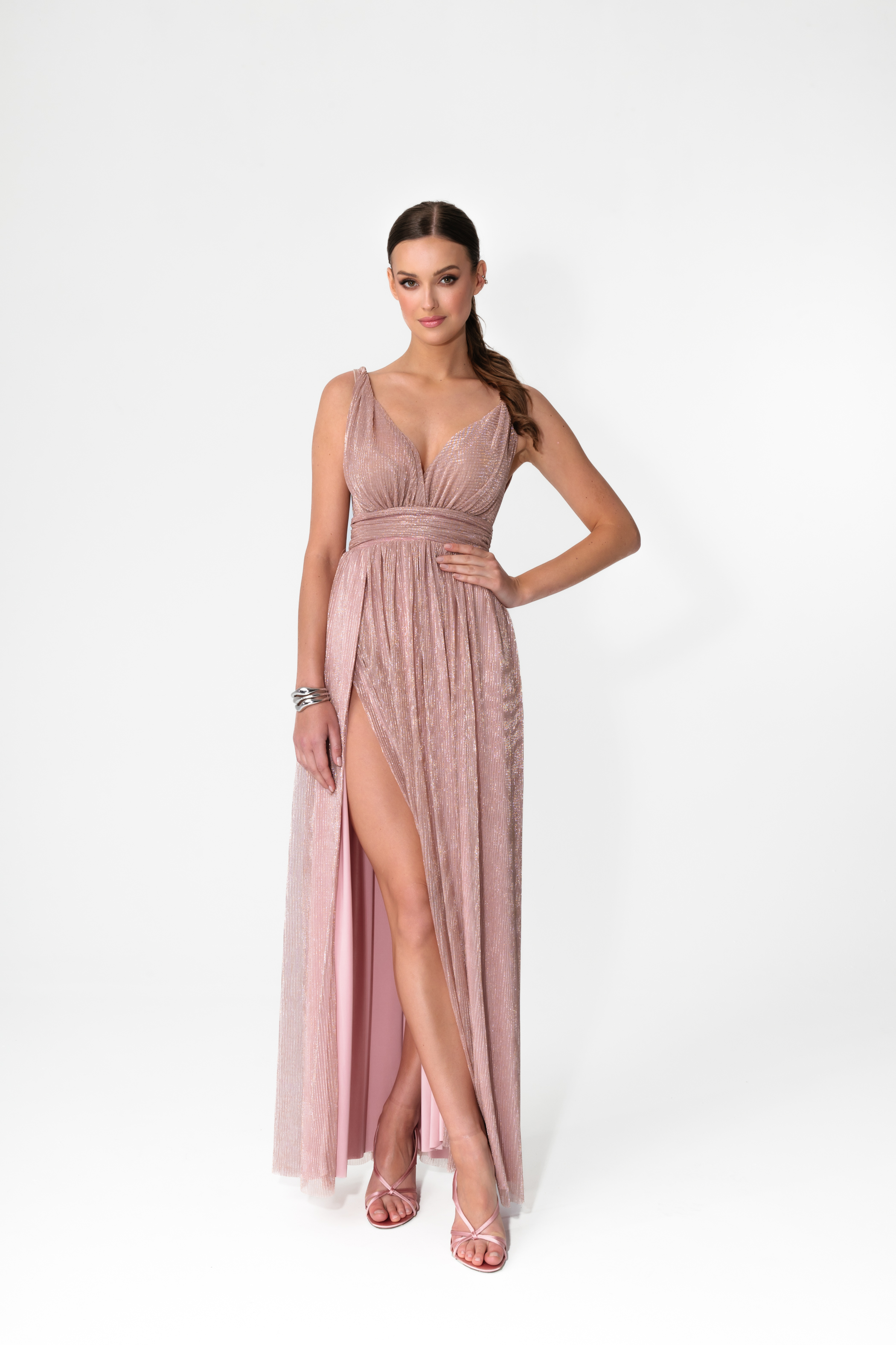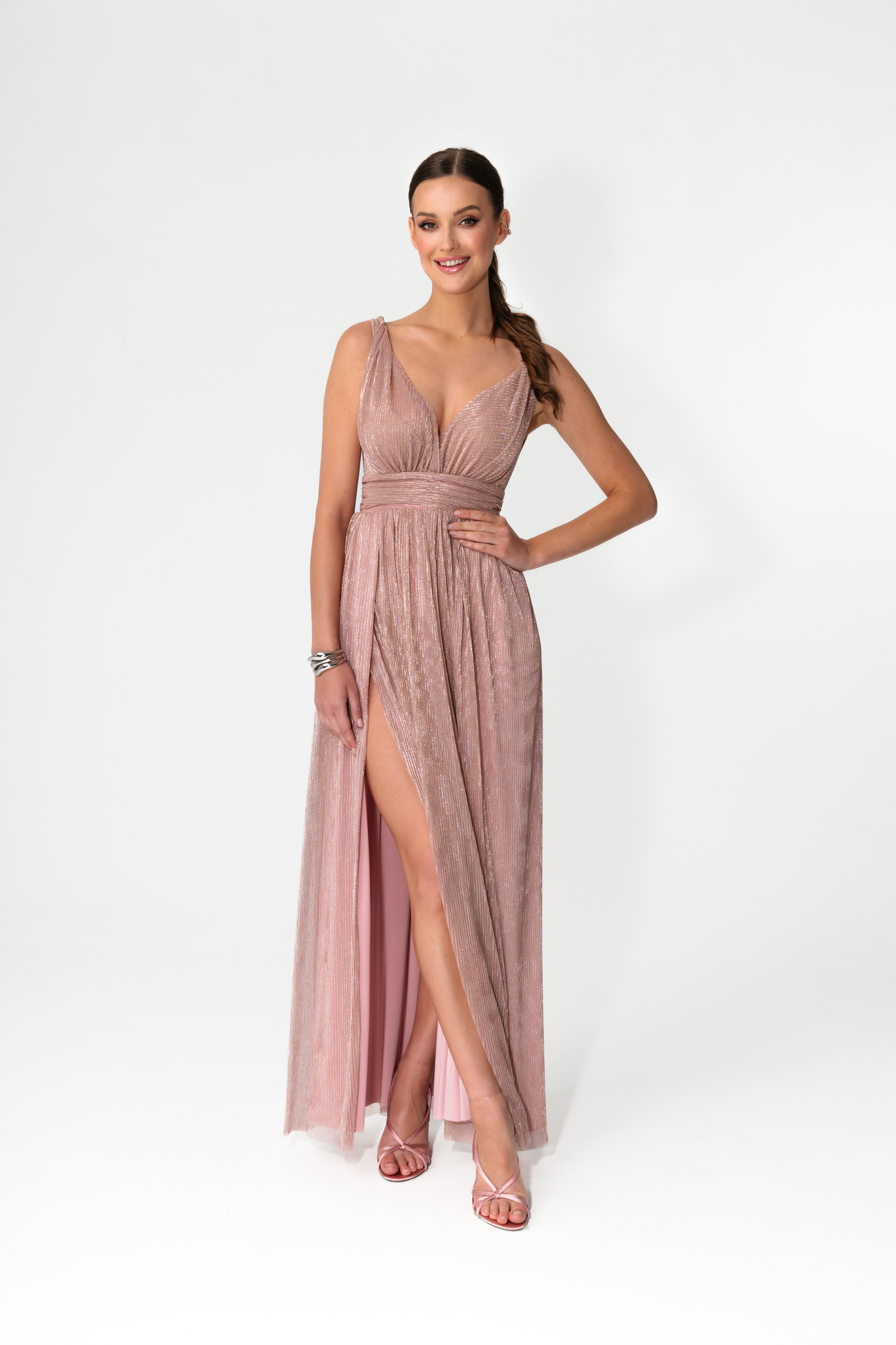 Elegancka, kobieca i spektakularna w ruchu. Sukienka MILO w odcieniu Champagne Pink to połączenie pudrowego różu z ciepłą nutą beżu i subtelnym efektem rose gold, który pięknie odbija światło i nadaje całości luksusowego charakteru.