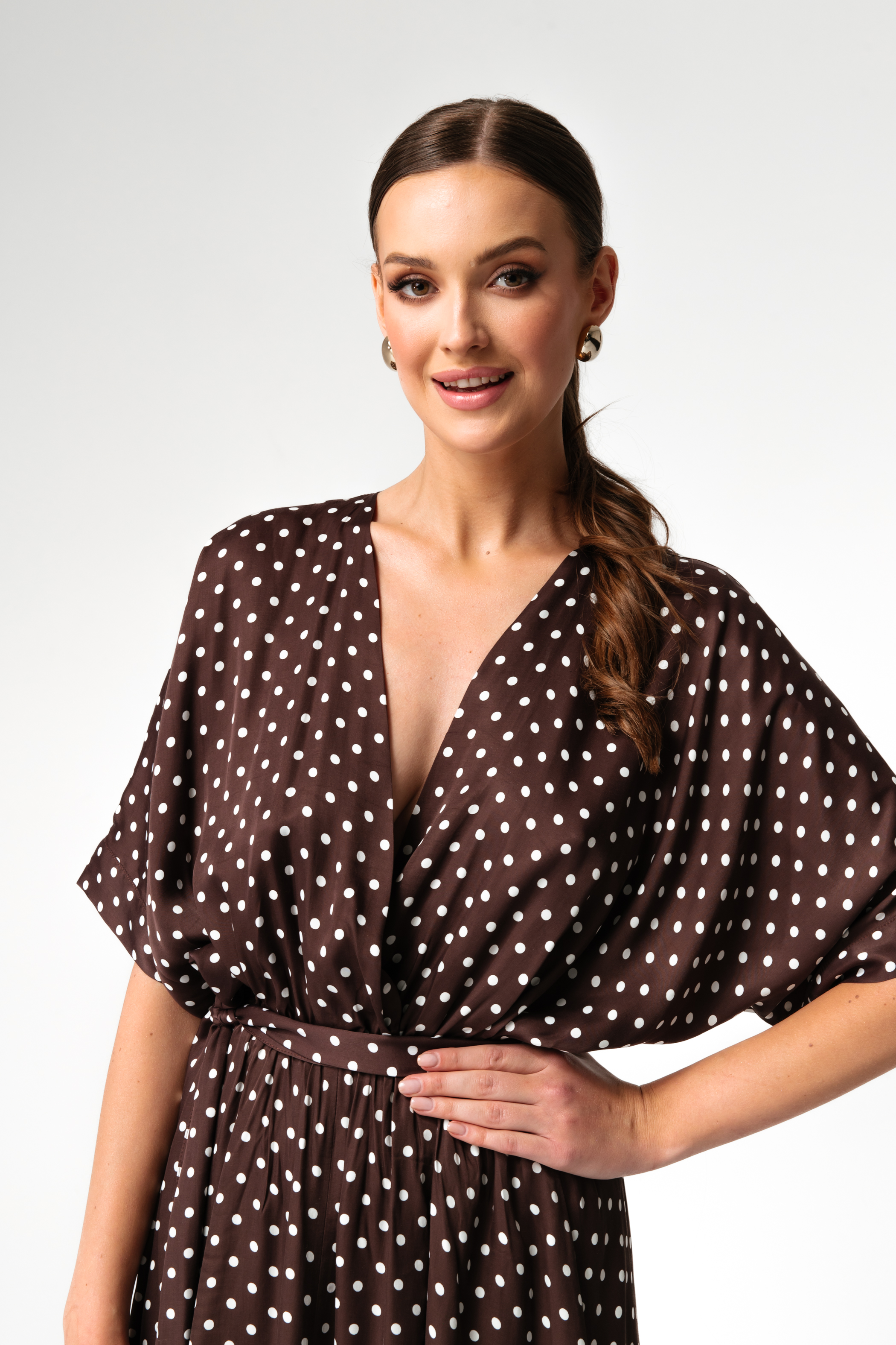 Lekka, swobodna i niezwykle kobieca. Sukienka NAIROBI w wersji Chocolate Dots to połączenie głębokiego brązu z delikatnym, ponadczasowym printem w groszki. Model, który przyciąga spojrzenia, ale pozostaje elegancki i niewymuszony.
